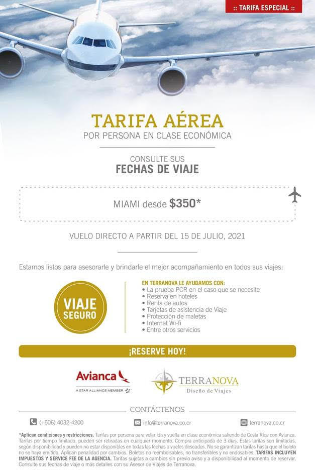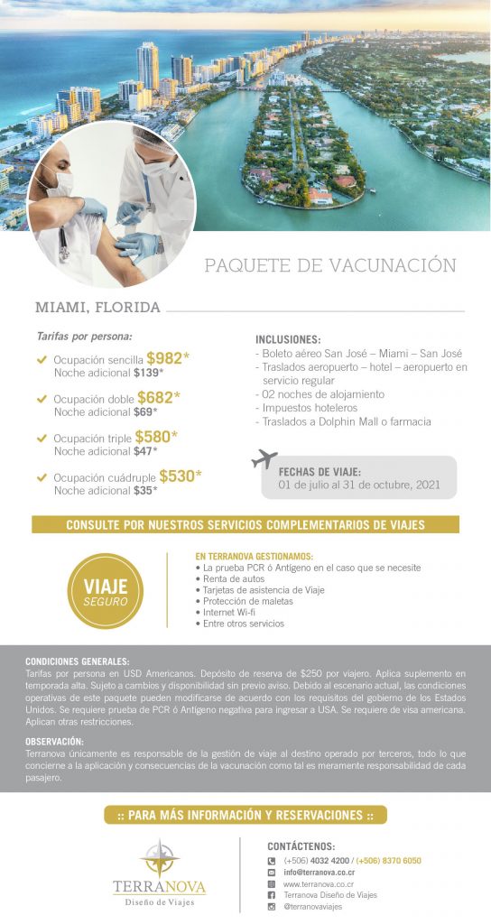 Pueden contactarlos mediante WhatsApp al 8370-6050, al correo info@terranova.co.cr o en la página web terranova.co.cr para obtener el precio de Asociado. La Asociación les ofrece un crédito de hasta 600,000 colones a 6 meses plazo para cubrir los gastos de viaje. Quiere vacunarse en USA o planear un viaje de 1 dia en Costa Rica, favor ver los adjuntos.